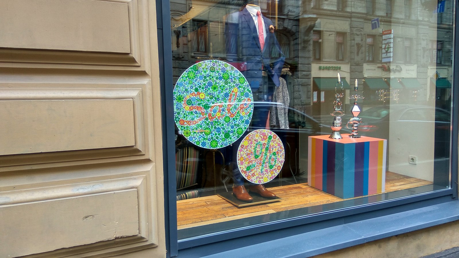 Выкладываю вторую часть для тех, кто говорил, что женщины не страдают дальтонизмом. Поэтому на женском магазине такие странные плакаты о распродаже.