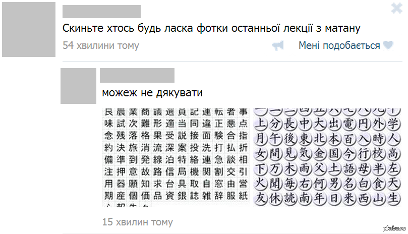 1 petya 12 лет назад Запись в группе нашей группы (звучит глупо). "Скиньте кто-нибудь, пожалуйста, фотки с последней лекции по матану". "Можешь не благодарить". [моё] Общество