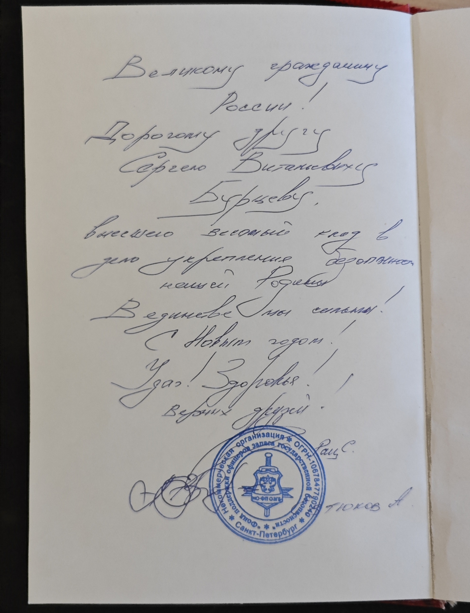 Дорогому другу Сергею Витальевичу Бурцеву, внесшего весомый клад в дело укрепления безопасности нашей Родины