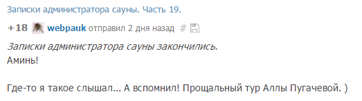 "Всем привет, меня зовут @goodmix, и я SaunaMan. Сначала я иногда писал посты о сауне. Потом начал делать это чаще и чаще, и сам не заметил как подсел на посты администратора сауны. Я столько раз пытался завязать...Но как только переставал постить у меня начиналась дикая ломка, меня выворачивало изнутри. Я в очередной раз срывался и садился писать очередную заметку админа сауна, но в этот раз совсем чуть-чуть, что бы попустило и всё. Это точно последний раз...надеюсь..."