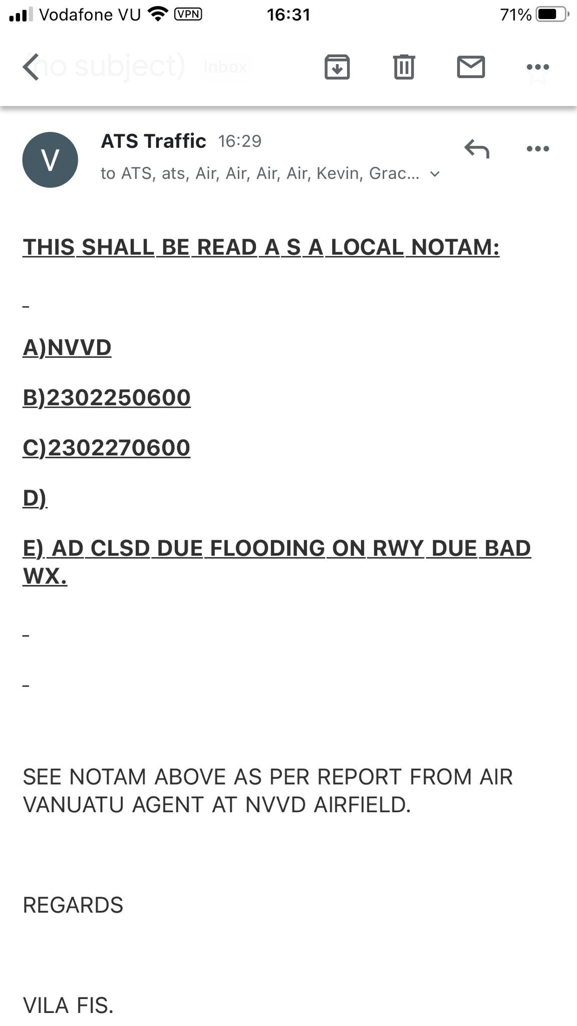 Через 10 минут после приземления в Виле, пришло сообщение о том, что полоса в Диллонс Бей затоплена и полеты туда остановлены. Оказалось, что пока мы летали в Ипоту, над полосой стоял сильный ливень и буквально за час затопил полосу, а бывший представитель Эйр Вануату, которые туда раньше летали, проинспектировал полосу и признал ее непригодной. Так что если бы мы всё-таки сели туда, то вряд ли смогли бы взлететь и пришлось бы там “куковать” ночь)