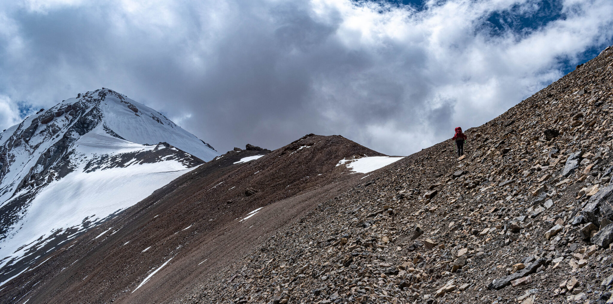 Подъем до лагеря 4100 м муторный, лезешь по крутому наклону, по сыпучим камням, но в целом пока шлось бодро. К 09:00 добрались до 4100, перекусили батончиком, обменялись телефонами с ребятами (я им обещал скинуть фотки). Пока результат неплохой, за 2.5 часа поднялись на 600 метров, самочувствие хорошее, на перевал до обеда успеваем.