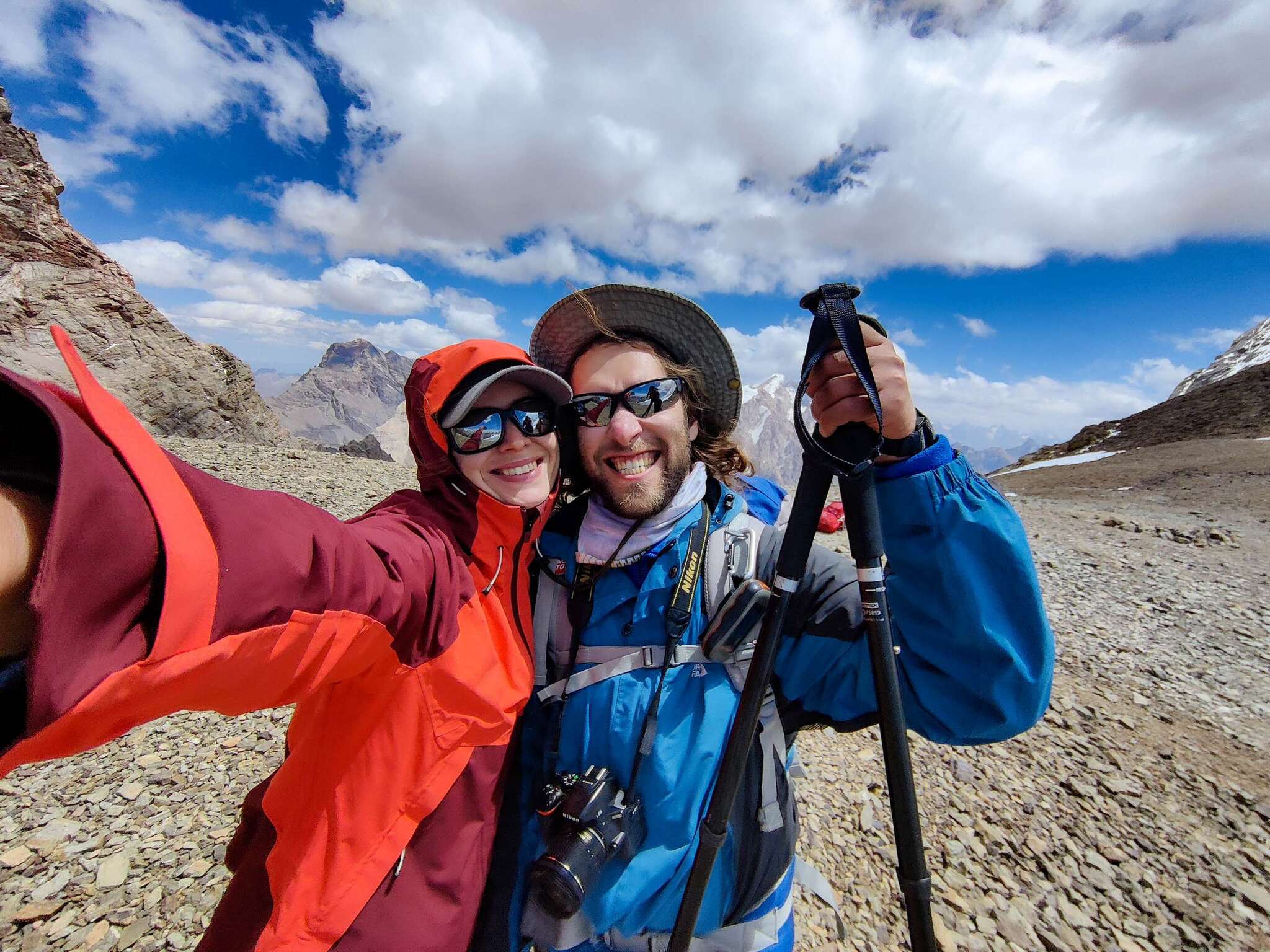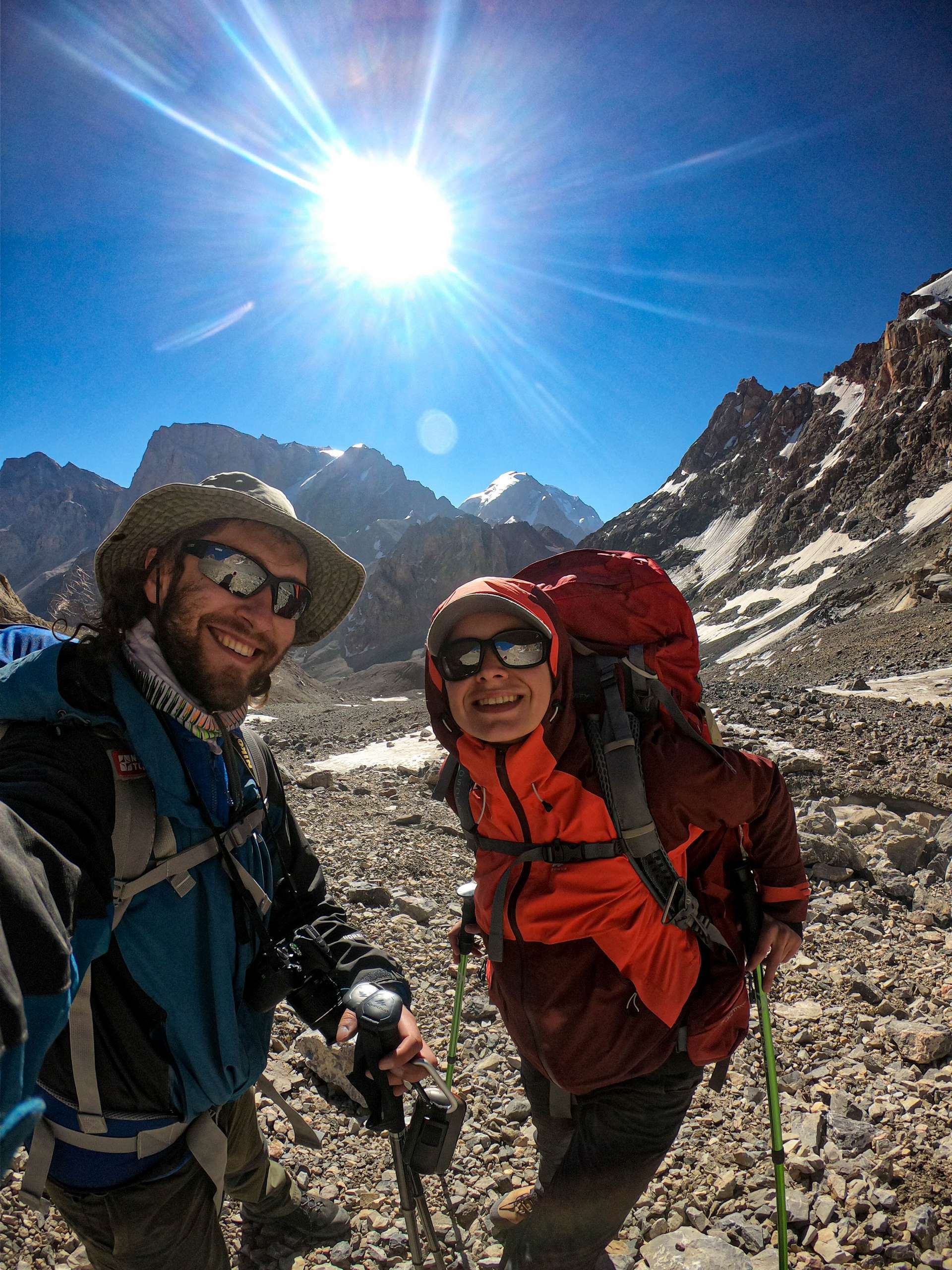 Еще через час залезли на 4400 метров, здесь тоже находятся места под палатки. Мы были ведущими по узкой сыпучей тропе с крутым уклоном, а ребята шли за нами. Здесь мне уже стало хужеть – заболела голова и на каждом усилии (шаге) пульсом выбивала боль в верхней части головы. Ребят мы попросили нас сфоткать на зеркалку (единственное наше совместное фото не селфи с похода) и пропустили их вперед. От головы выпил спазган.