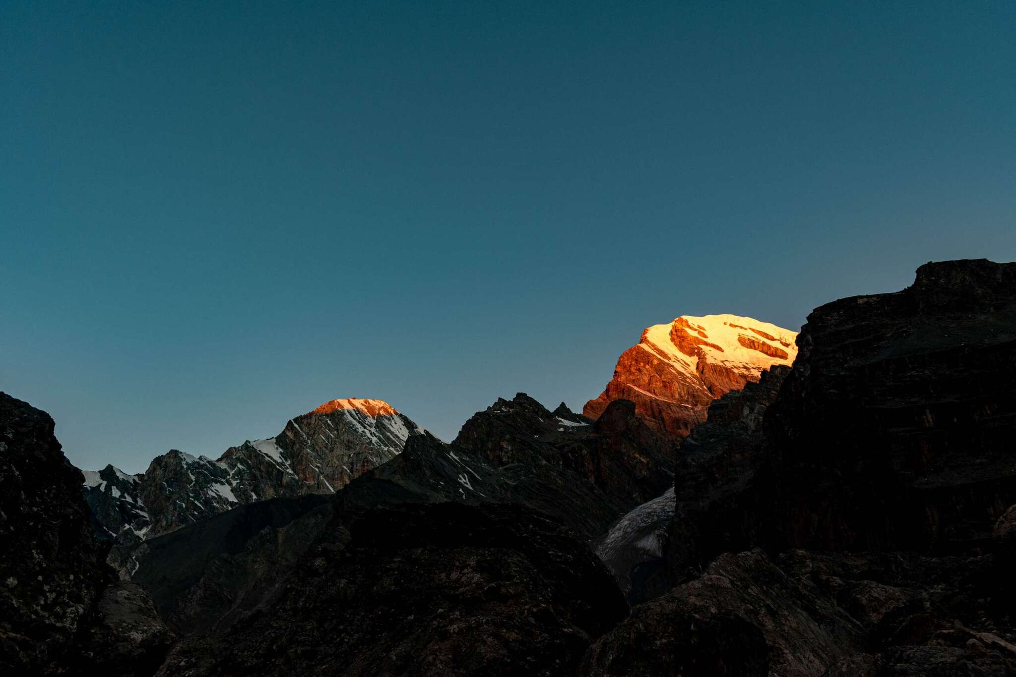 Первые лучи солнца в 05:30 на вершинах Энергия и Чимтарга