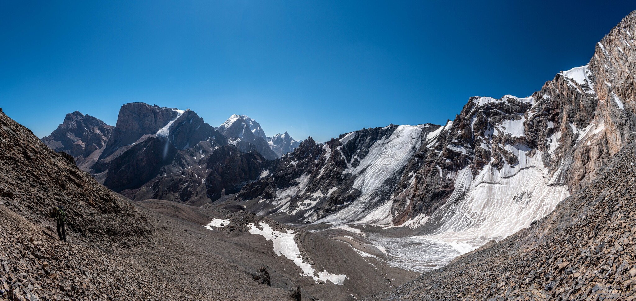 План, конечно, не для слабонервных. Сначала подъем на 1240 метров на перевал Чимтарга (1Б, 4740 м), а потом спуск на 1573 метра. Общая протяженность при этом порядка 13 км. Что для таких высот и с рюкзаками дофига. При спуске с перевала по пути на озеро Большое Алло есть 2 стоянки на равном расстоянии. Если что, то сможем переночевать на них.