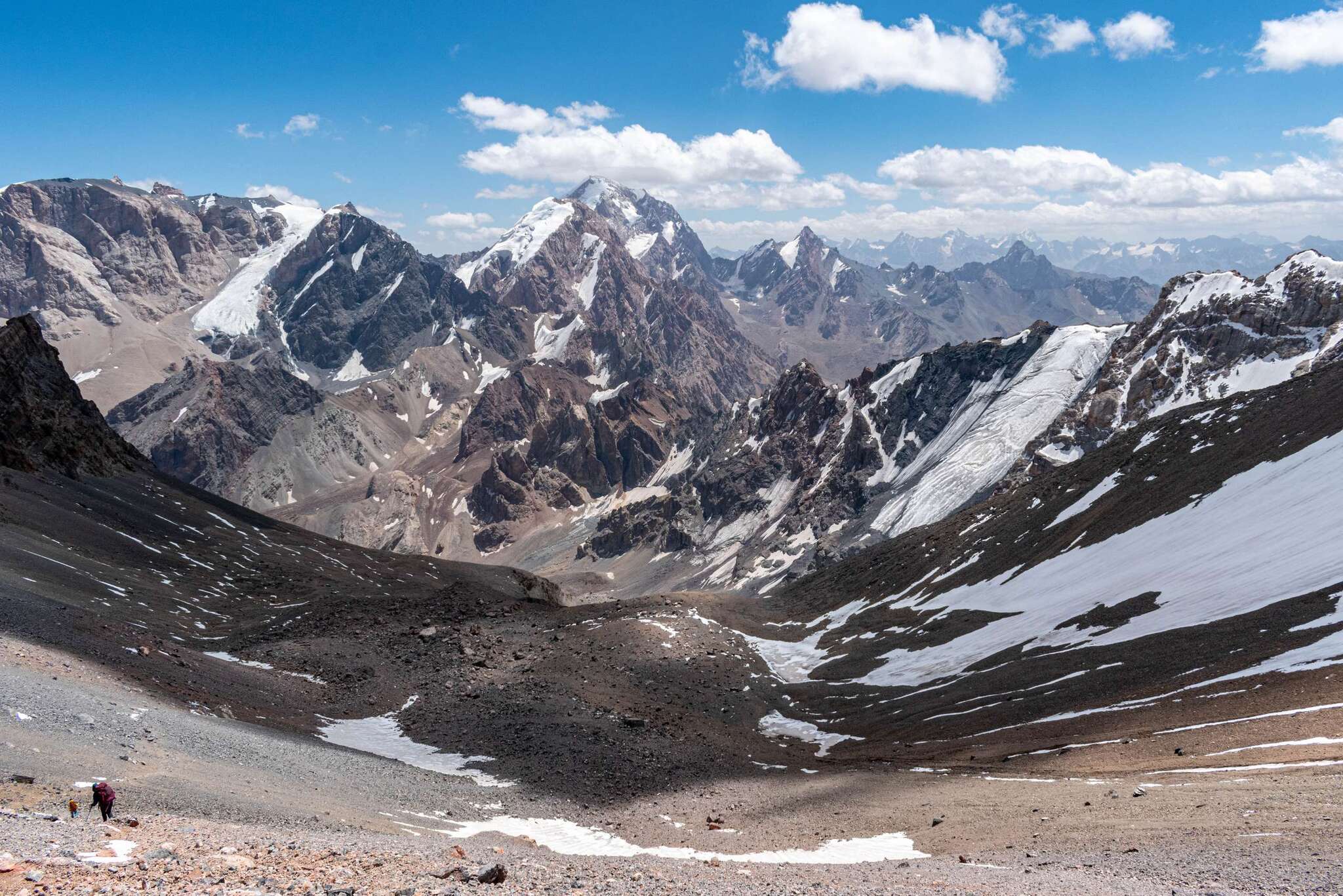 На перевале красота! Появились высокие белые облачка, ещё больше украшая фотографии. По обе стороны перевала в глубокую даль уходят снежные горы, холодные и величественные. По правую руку высится Чимтарга, её южный склон, а слева вершина Энергия, которую многие приезжают сюда покорять. Перевал Чимтарга (1Б, 4740 м) это наивысшая точка, на которую мы сами забирались. Ветер здесь очень сильный, почти сбивает с ног. Поэтому быстро пофоткались, сняли видео и скорее вниз.