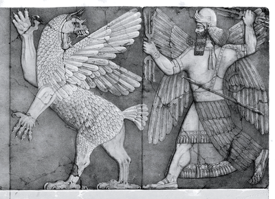 Здесь изображена сцена охоты. Две фигуры. Первая фигура слева, с луком и двумя колчанами за плечами: гибридное существо. Голова мужчины, хвост и лапы птицы. Перед ним крылатое существо с головой льва и лапами птицы. Очень популярная тема в этот период.