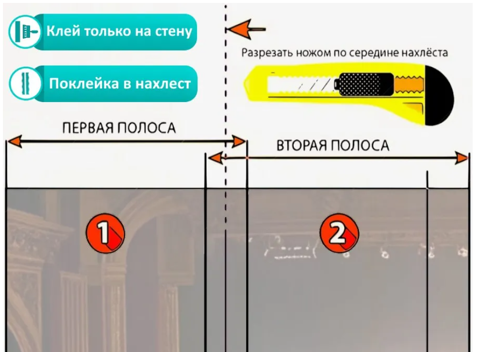 Наши обои нужно клеить в нахлест, то есть на каждом листе есть 2.5 см рисунка следующего листа, при поклейке обои надо наложить друг на друга и сделать рез по центру наложения, таким образом можно скрыть возможные неровности стены и шов становится практически незаметен. Об этом мы пишем в описании, в слайде и прикладываем распечатанный листок в упаковку.