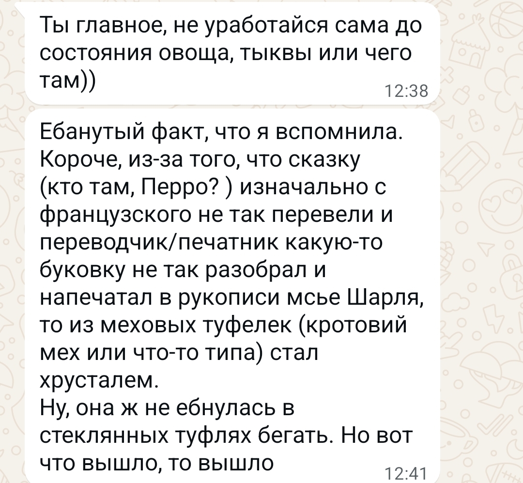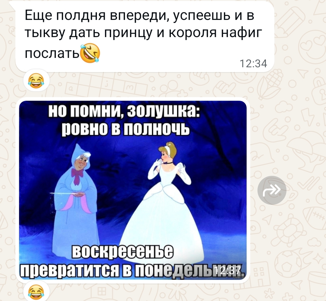 Так же из недавнего забавного. Прилетело мне задание - в семечках на развес навести порядок, ибо тыквенные смешались с подсолнечными. Пока я этим занималась, мне и коллеги, и покупатели говорили, что я прям Золушка. Написала я вот такое сообщение друзьям: