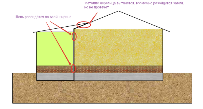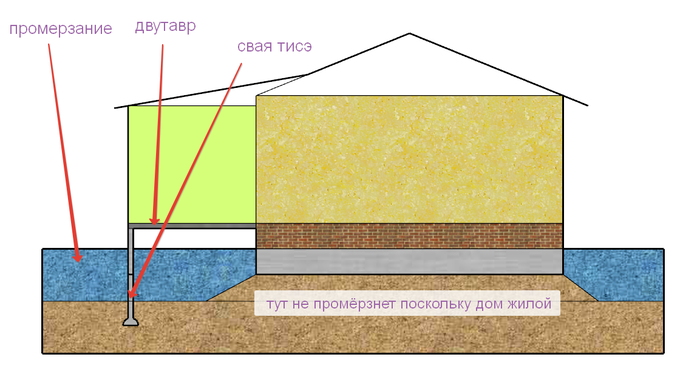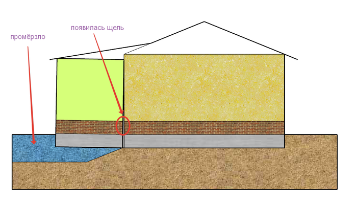 Поскольку пристройка холодная. Около дома земля тёплая её пучить не будет. А у края может промёрзнуть. И получится так.