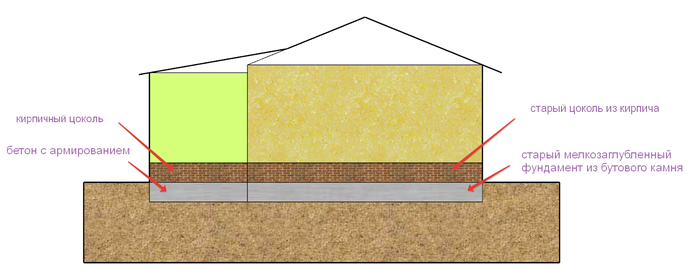 Был предложен простой и надёжный вариант. Пристройка лёгкая, не очень широкая. Поэтому сделать штучки три-четыре буронабивных сваи с расширением (ТИСЭ) ниже уровня промерзания.