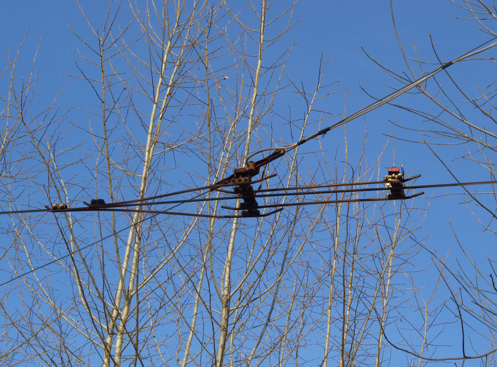 Так как троллейбус ездит по дороге на пневмошинах, то у него нет "земли", или проще "-" поэтому очень грубо говоря можно сказать, что над троллейбусом два провода "+" и "-" . У трамвая роль плюса выполняет провод, а минуса - рельсы (да-да, по рельсам тоже идет ток)