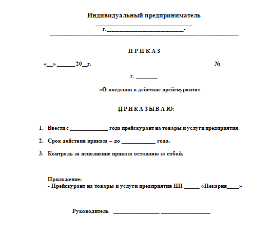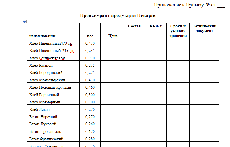 - копия Приказа об утверждении Прейскуранта основного ассортимента. Приложение к приказу: наименование/цена/вес/состав/б,ж,у,Ккал, сроки и условия хранения