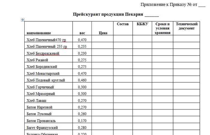4. Приказ об утверждении Прейскуранта временного ассортимента. Приложение к приказу наименование/цена/вес/состав/б,ж,з,у,Ккал, сроки и условия хранения.