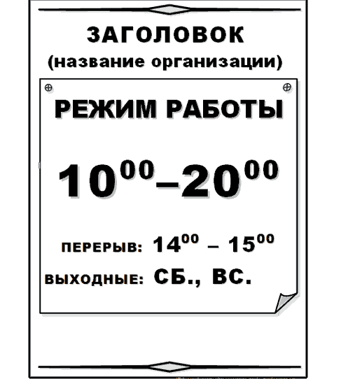 - Режим работы. Фирменное наименование организации.