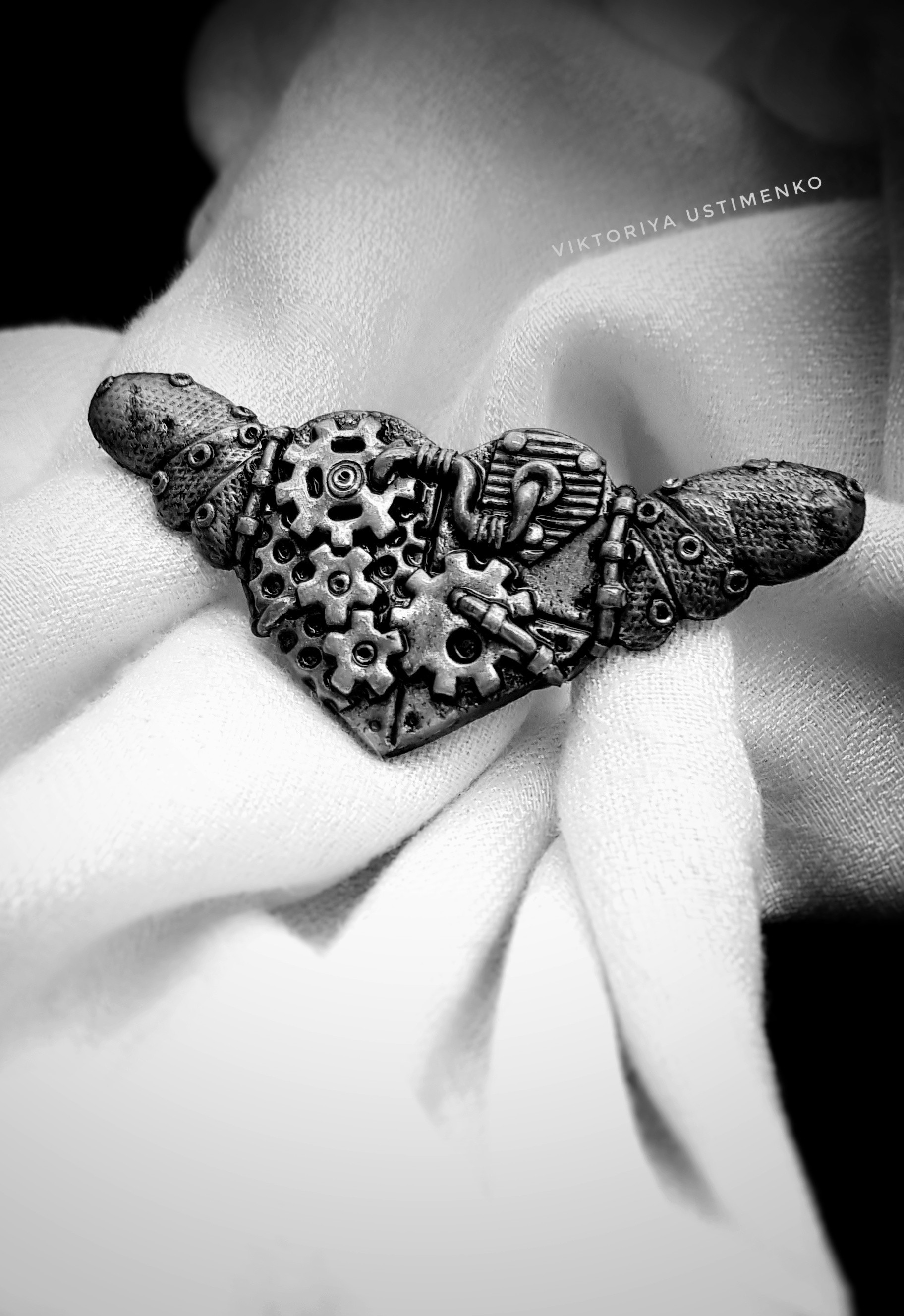Материалы: полимерная глина Cernit, акриловые краски (серебро и черная), лак, застёжка для брошки.
