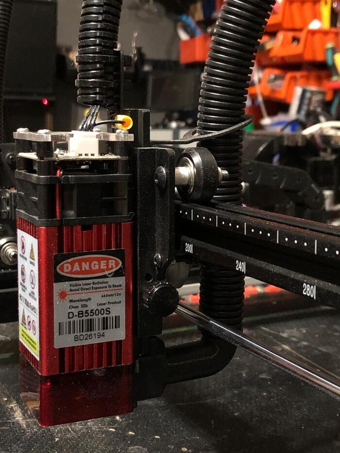 Очень простая сборка. Понравилось в механике почти все. Исключением является лишь не очень удобное позиционирование лазерной головы относительно заготовки. При закручивании винта голову чуть чуть опускает вниз, что сбивает фокусировку лазера. Можно приноровиться.