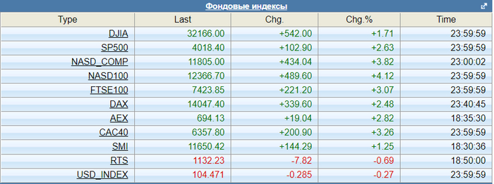 Мировые финансовые индексы. Есть надежда, что мировой финансовый кризис завтра не начнется. При всём злорадстве (с), лучше бы обойтись без него. Все биржи выросли, индекс доллара припал. Это говорит о том, что паническая распродажа всех активов, кроме доллара, по меньшей мере приостановилась.