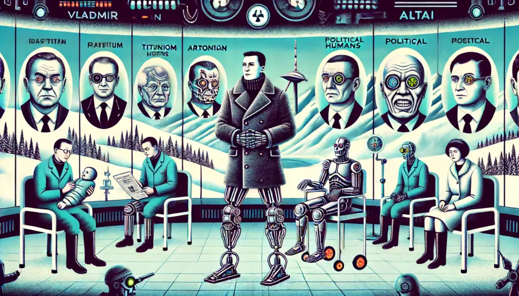 Следующий роман «Доктор Гарин», в котором доктор уже с титановыми протезами вместо ног — уже немножечко киберпанк — со своей молодой возлюбленной Машей. Он такой психотерапевт, наверное, в закрытой клинике в Алтае лечит искусственно выведенных людей, которые фактически являются политиками, легко узнаваемыми. Что они собой представляют? Огромные ягодицы со ртом. Но при этом они неплохо управляли разными людьми и странами. В одном из них угадывается легко Ангела Меркель, в другом – Владимир Владимирович Путин, в третьем, по-моему, Макрон.