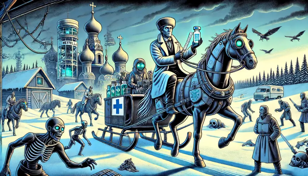 У «Наследия» есть два предшественника, в которых сюжет будущего романа постепенно созревал. Это повесть «Метель», ну или рассказ, мнения разнятся, где впервые появляется доктор Гарин. Это такой оммаж, собственно, к «Метели» Пушкина. Доктор едет в метель в какой-то поселок в Алтайской области, если не ошибаюсь, где обнаружен некий вирус, из-за которого люди начинают вести себя как зомби: кусать и есть других людей. А у доктора есть вакцина, и он её везет с большими сложностями. У него там киберлошади и карета на воздушной подушке, потому что он везет эту вакцину, а она должна быть в сохранном виде.