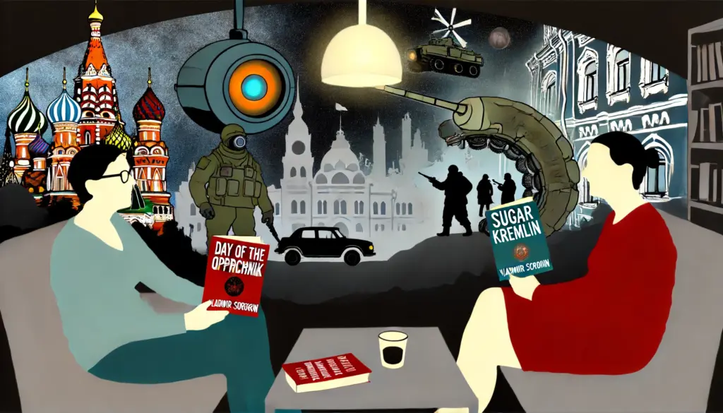 Ну вот мы говорили про «Ледяную трилогию», а еще одна важная часть творчества Сорокина – это «День опричника» и «Сахарный Кремль». «День опричника» — это роман, а «Сахарный Кремль» — сборник рассказов. Оба произведения исследуют тему тоталитаризма и власти. В «Дне опричника» описывается один день из жизни опричника в будущем, где власть и насилие переплетаются в единый механизм. «Сахарный Кремль» развивает эти идеи, показывая, как власть может изменить и исказить реальность. Там, мне кажется, Сорокин деконструирует и выворачивает скорее уже российский, постсоветский миф о сильной руке. Эта же деконструкция продолжается и в «Наследии».