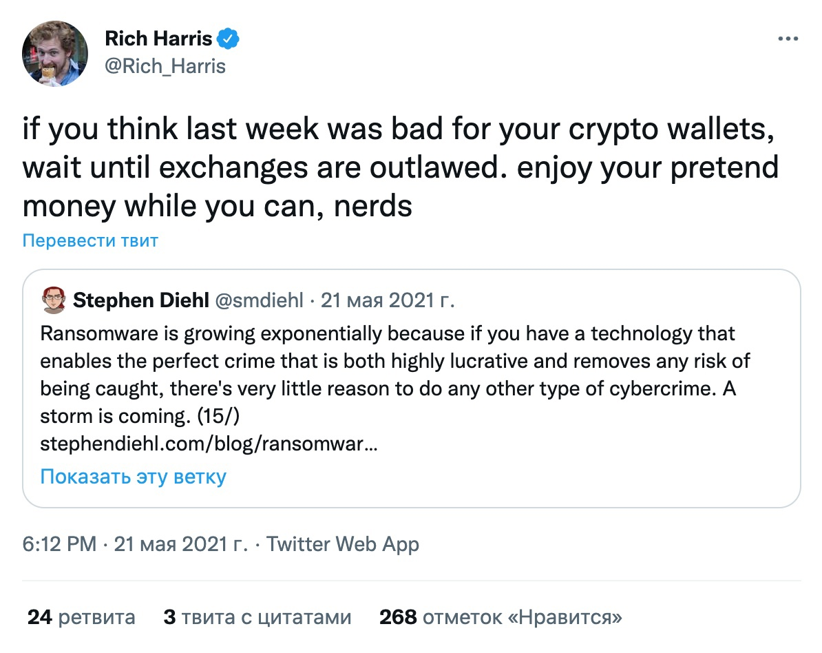 Рич Харрис (создатель front-end фреймворка Svelte, и единственный человек, на которого я подписан в Твиттере) — год назад сделал заявление, что из-за угрозы распространения ransomware (программ-вымогателей), правительства будут вынуждены запретить криптовалюту: