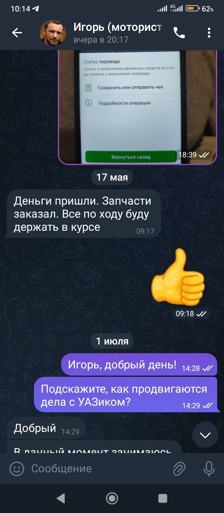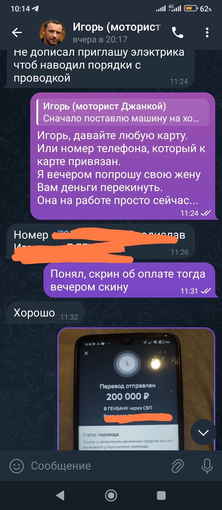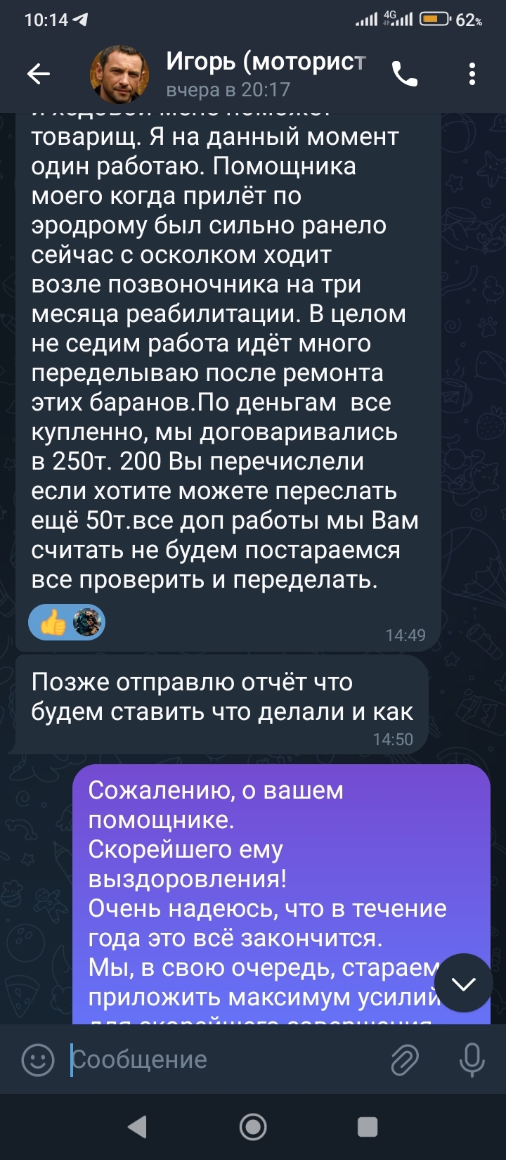 На данный момент, мастеру передано 250 тысяч рублей. Из них, 200 тысяч были переведены, 50 тысяч отданы наличкой. Также, куплены и доставлены транспортной компанией некоторые запчасти.
