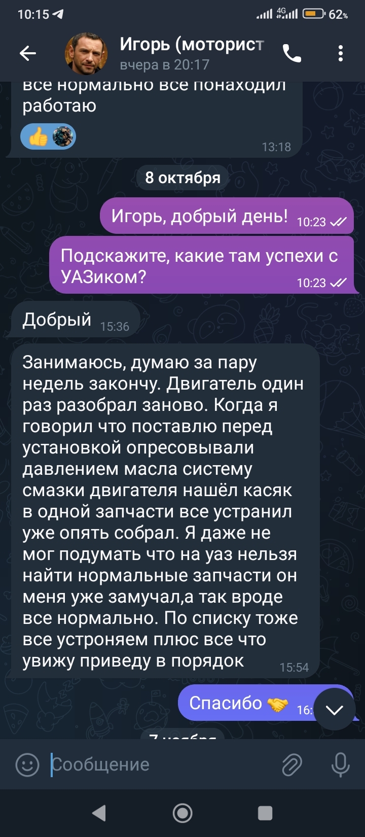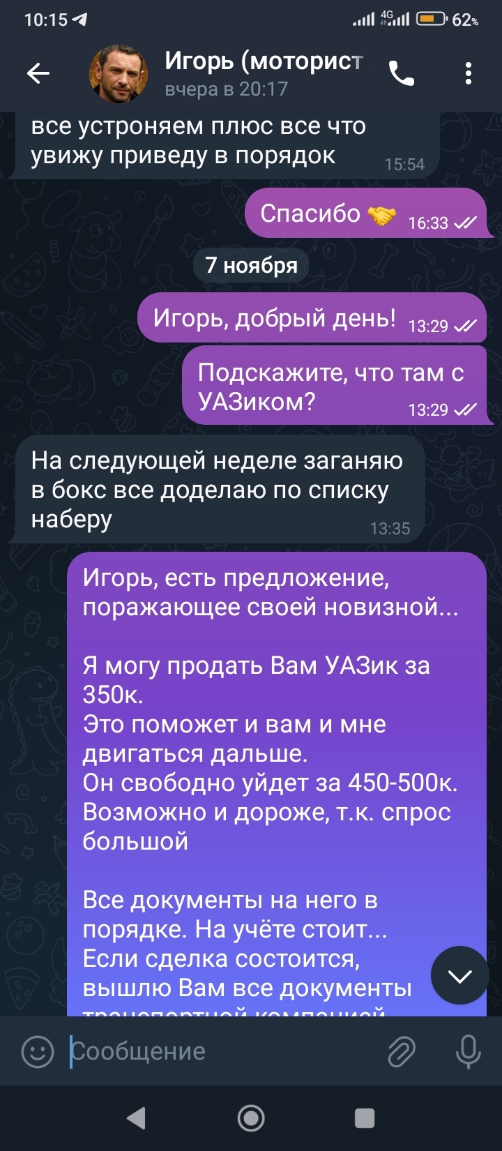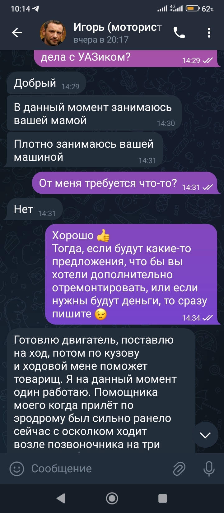 В мае 2024 года УАЗик был эвакуирован к мастеру. Сроки ремонта не "горели". Но, до сегодняшнего дня, УАЗик всё ещё не отремонтирован. У человека, который "ремонтирует" УАЗик находятся постоянно "тысячи" причин, чтобы им не заниматься.