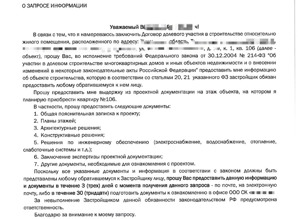 Запрос проектной документации у застройщика