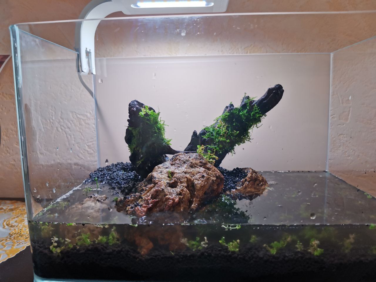Итак, свершилось, решил я снова запустить аквариум. В этот раз на грунте PRODIBIO, правда планирую неразогнанный травник... для души просто, без СО2. В итоге, вот так получилось. (слева вверху это просто воткнул мирт, чтобы корни пустил :-), а монте карло... изначально брал меристему с гигантской скидкой наполовину сгнившей, думаю выживет что нибудь..)