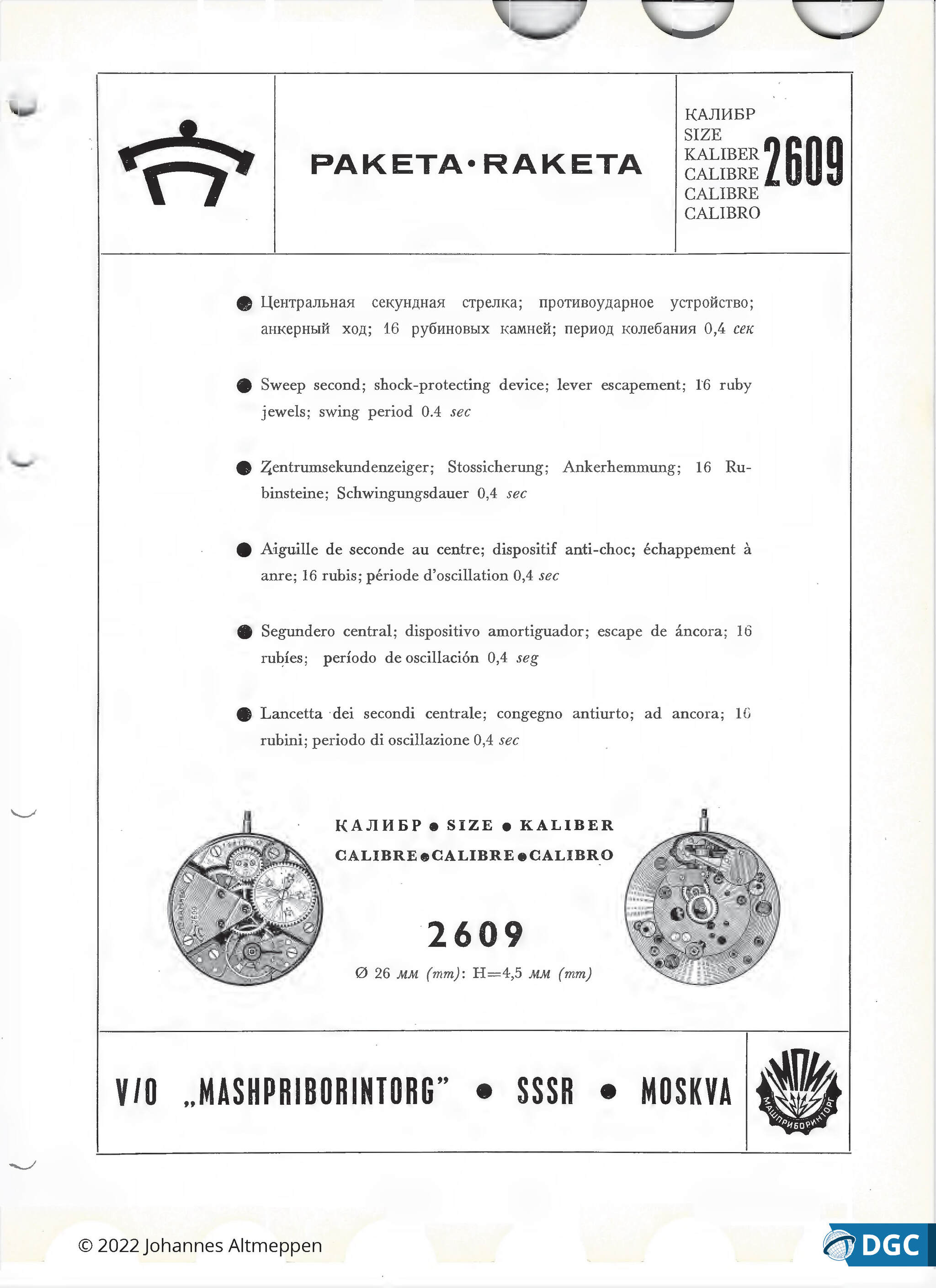 Цифры 2609 говорят нам, что механизм диаметром 26 мм, с ЦСС, в базовой комплектации. Механизм на 16 камнях, период колебания 0,4 сек.