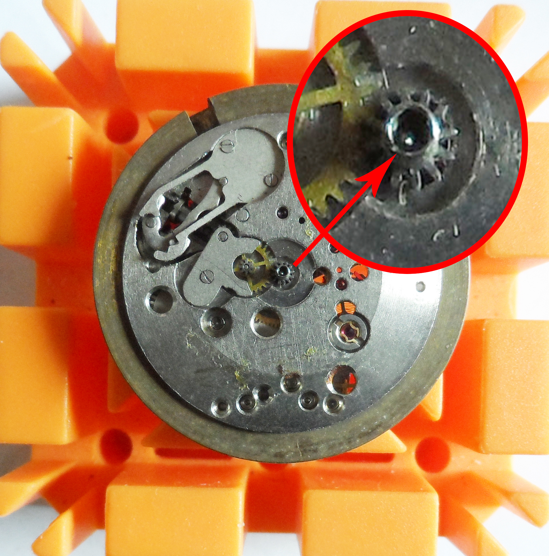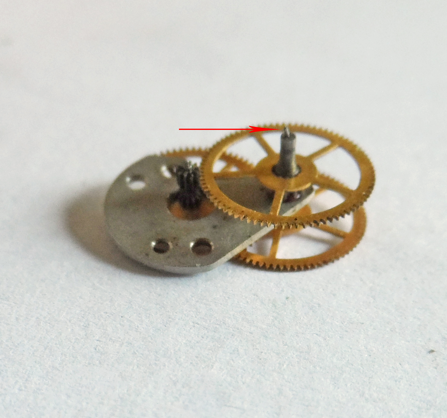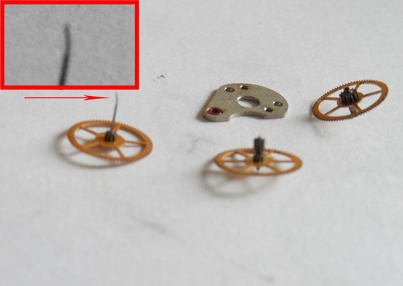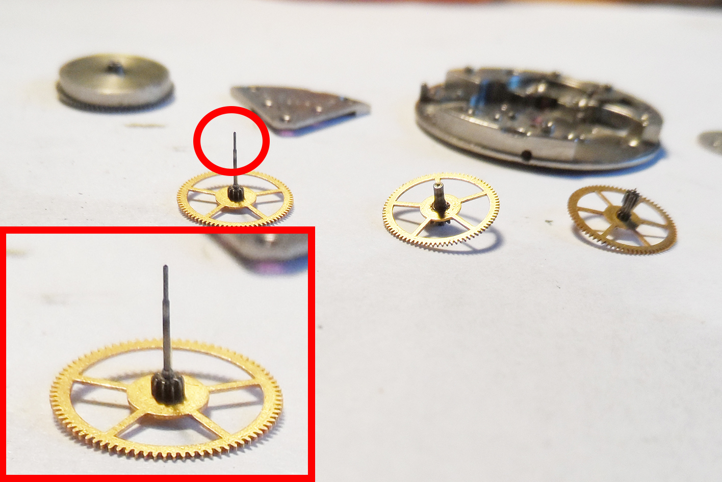 Визуально часы комплектные, но не идут. После фотографирования была замечена первая неисправность - искривлена ось секундного колеса.
