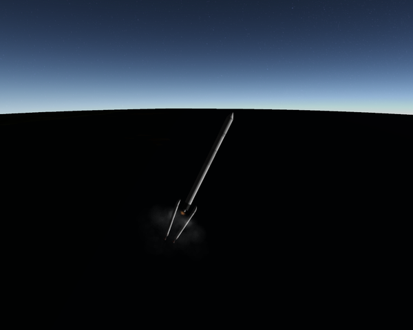 Теперь перейдем к ракете-носителю (далее РН). Она двухступенчатая. Первая ступень керосин-кислородная, двигатель российский, РД-191. Предназначена для подъема ракеты до 200км в суборбитальный полет. Вторая ступень также керосин-кислородная с отечественным двигателем- НК-43 в модификации для вакуума (более длинное сопло для большего удельного импульса). Предназначена для разгона до первой космической скорости. В результате тестовых запусков оказалось, что у РН низкая тяговооруженность на старте. Исправляется это легко: добавлением двух твердотопливных ускорителей (ТТУ) американского производства, используемых в реальной жизни на РН Атлас-5. Теперь можно перейти к самому интересному- скринам. Вот, собственно, ракета на стартовом столе.