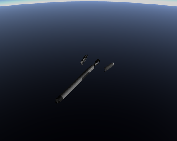 И выключение первой ступени с последующим ее отстрелом. Видно также раскрытие солнечных панелей.