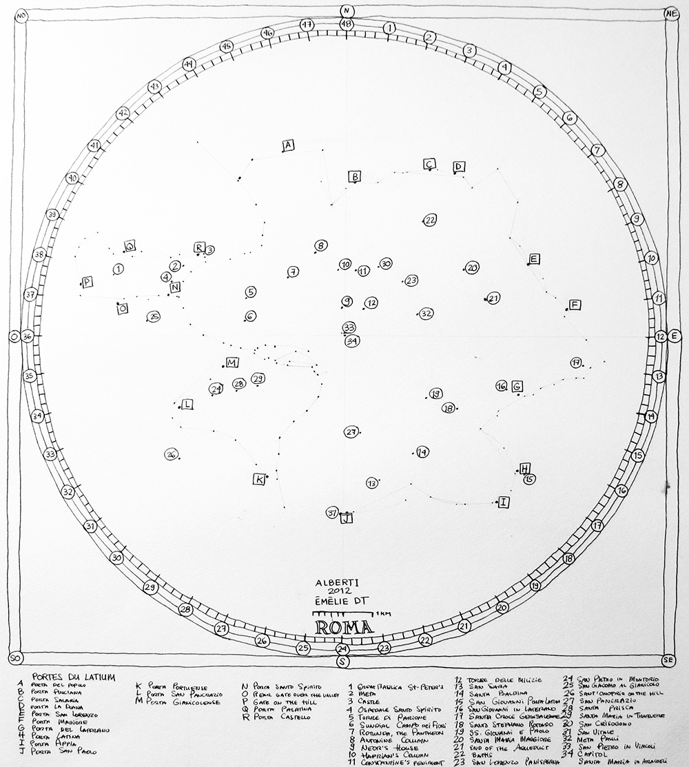 Проводя исследования и обмеры античных памятников, Альберти составил ряд справочных таблиц, указывавших расстояния, размеры и местоположение античных памятников. Главная задача Альберти – объяснить, как можно измерить расстояния между зданиями в Риме, и отразить это на карте. Композиционный акцент в этой карте поставлен на античных постройках верхнего города - Пантеоне, Форуме, Колизее, акведуках, колоннах Трояна и Марка Аврелия, в то время как постройки ренессансного времени - замок Сан-Анжело, Борджио и собор св. Петра отделены от города Тибром.
