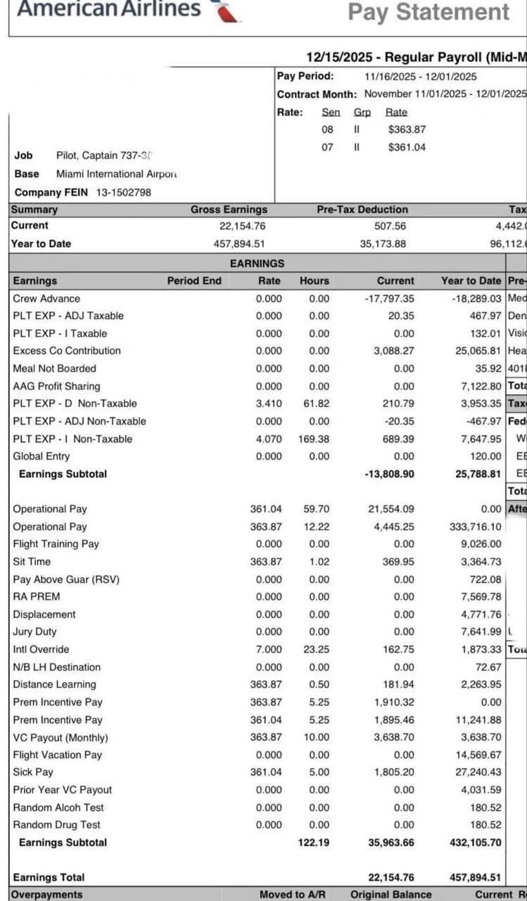 Капитан Boeing 737 авиакомпании American Airlines, базирующийся в Майами, опубликовал на Reddit свою реальную зарплатную ведомость за текущий год. Пост вызвал неоднозначную бурную реакцию.