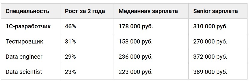 Профессия 1С-разработчик демонстрирует самый внушительный рост доходов среди всех IT-специальностей — 46% за два года. Спрос на 1С-специалистов остается высоким, и ситуация вряд ли кардинально изменится в ближайшие годы.