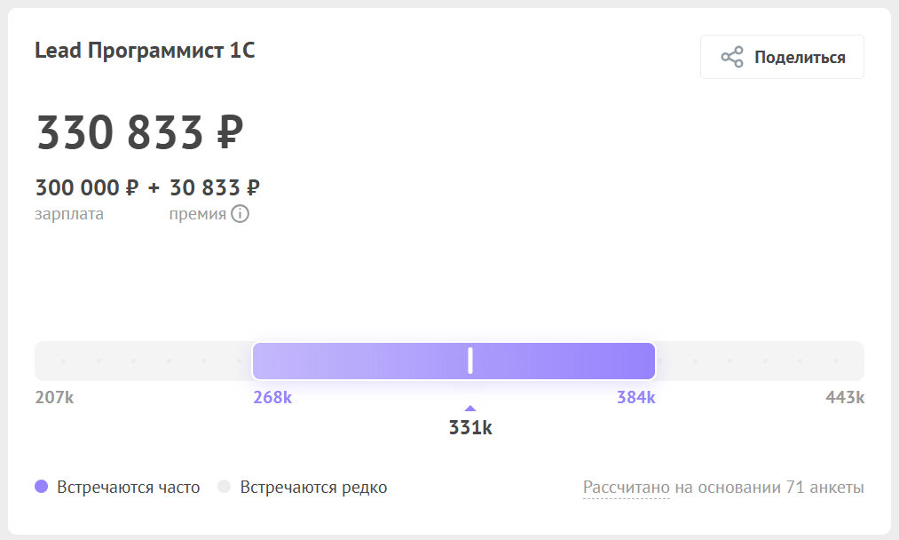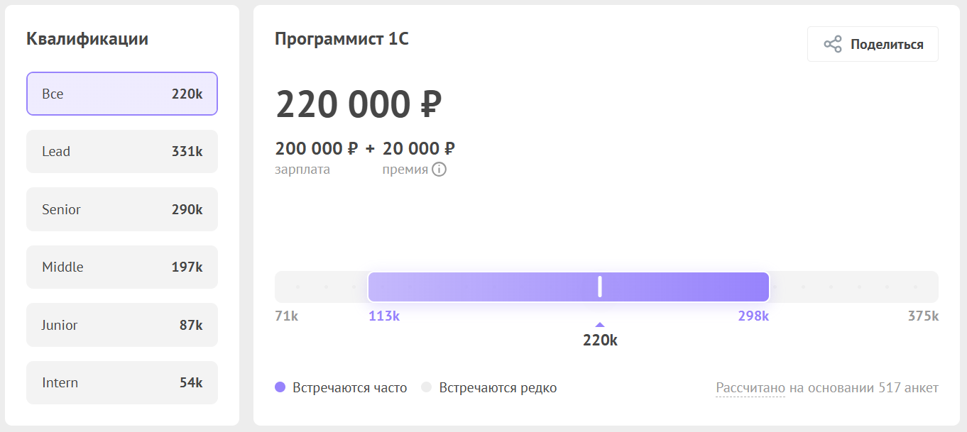 Если же обратиться к статистике Hh Карьеры, то заработок в сфере 1С-программирования составляет от 100 000 до 450 000 рублей.