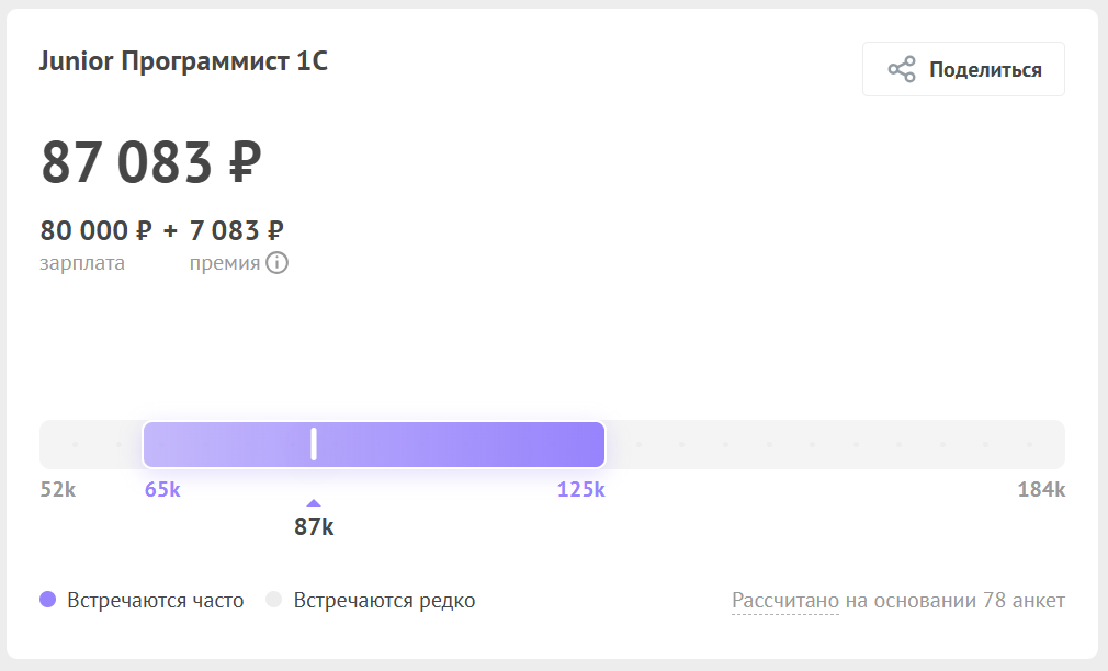 По данным Hh Карьеры, 1C специалист-новичок на старте карьеры может претендовать на зарплату от 65 000 рублей в месяц. В Москве вакансии традиционно «дороже» — там можно найти первую работу в 1С-разработке с зарплатой от 90 000 рублей в месяц.