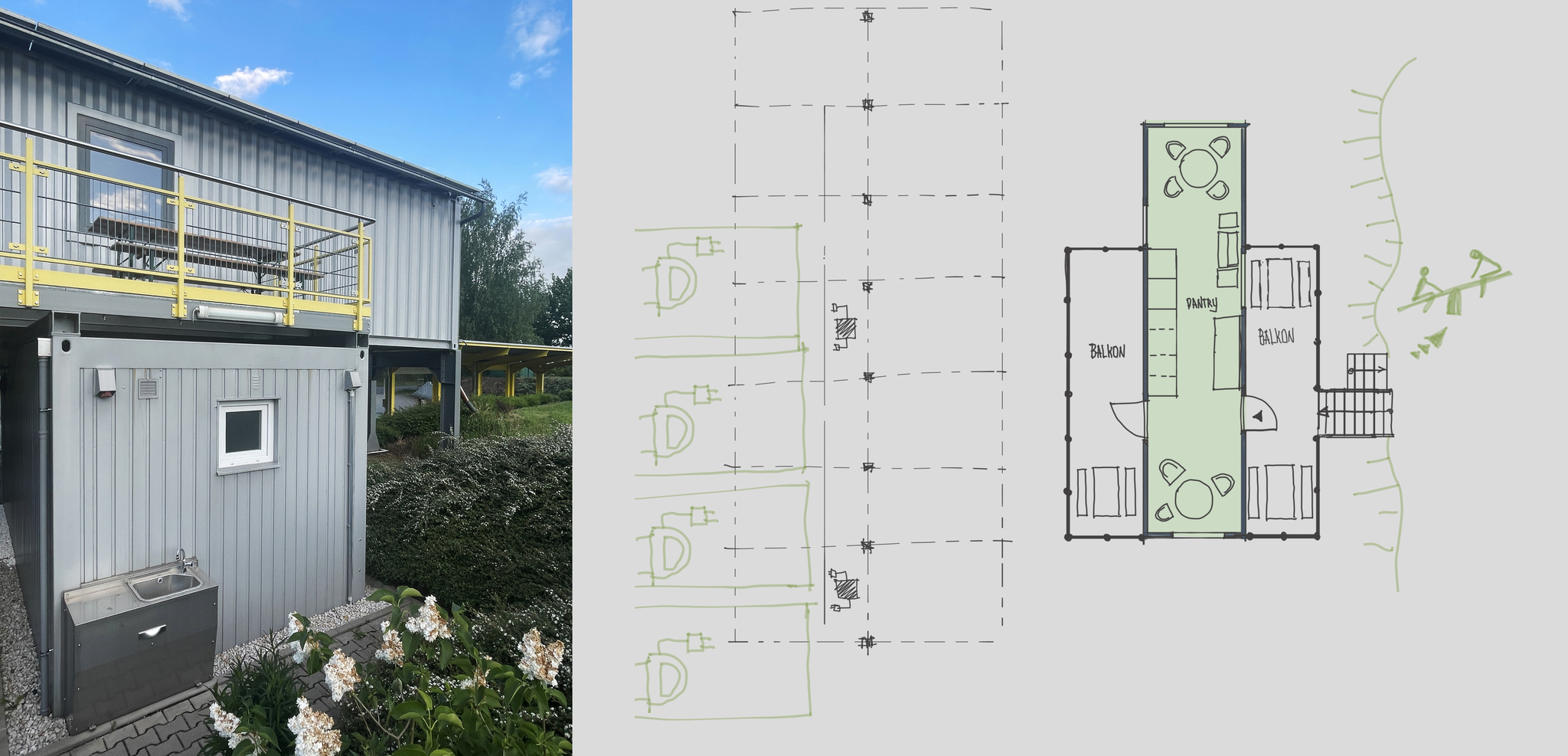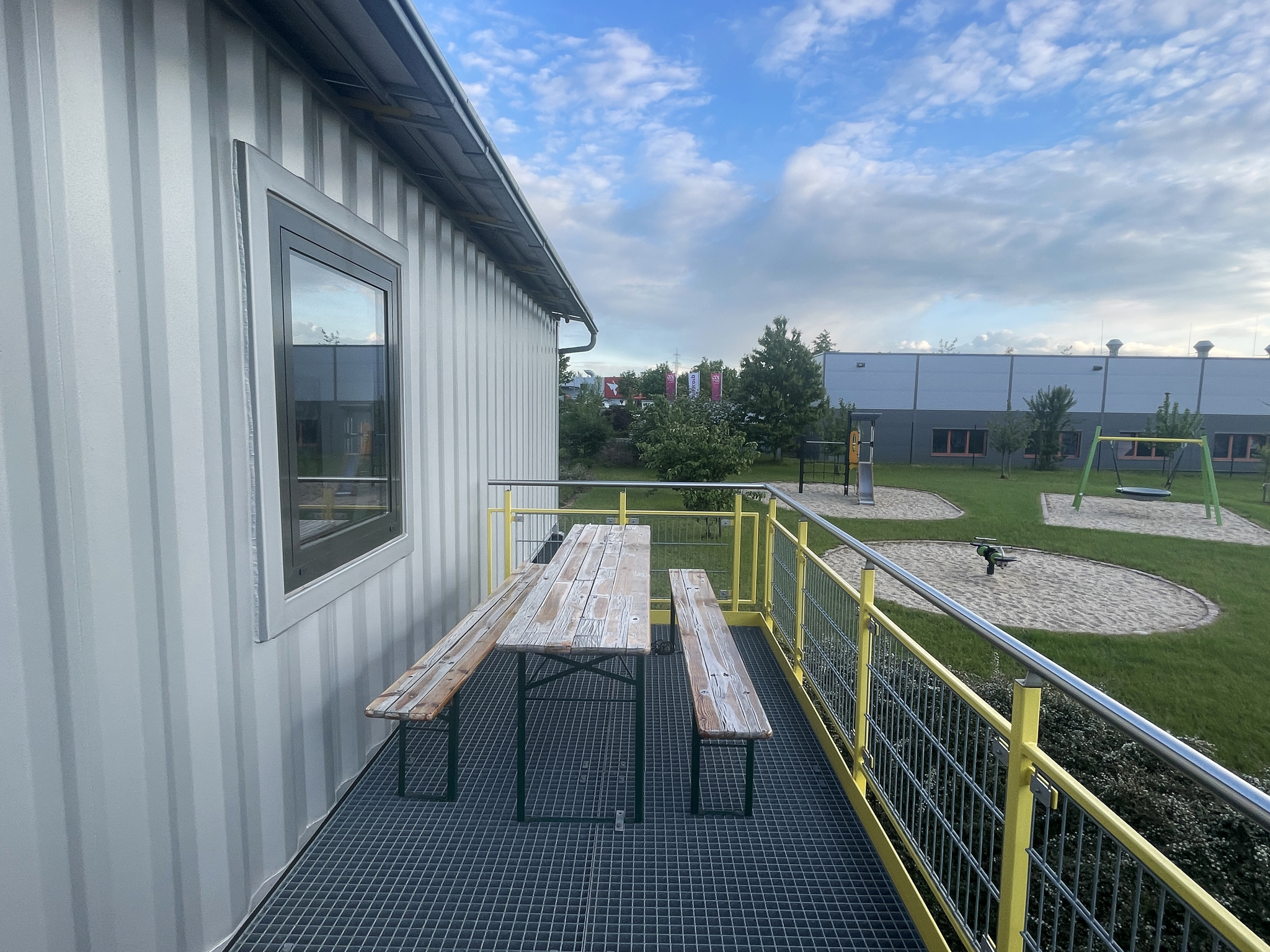 Про благоустройство тоже не забыли - рядом с контейнерами оборудована детская площадка для маленьких путешественников. В хорошую погоду можно расположиться и на свежем воздухе - с двух сторон устроены балконы с лавочками и столиками.