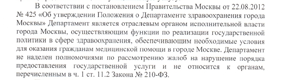 Таким образом, напротив, вопреки утверждению заместителя прокурора города Москвы, именно ч. 1 ст. 11.2 Закона № 210-ФЗ и постановление Правительства Москвы от 22 августа 2012 года N 425-ПП обязывают Департамент рассматривать жалобы на решения и действия (бездействие) руководителей медицинских организаций города Москвы в сфере предоставления государственных услуг.