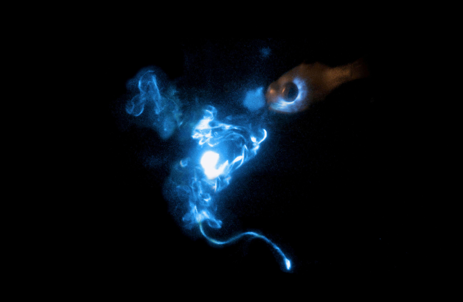 На фото вы видите небольшую рыбку (вверху справа) из семейства апогоновые (кардиналовые), которая выплевывает облако света. Маленькое пятнышко внизу на конце светящейся дуги — крохотный рачок, которого до этого рыбка проглотила. Попав к ней в рот, ничем внешне не примечательный рачок вдруг стал испускать свет. Полупрозрачная рыба тоже начала светиться, и ей пришлось выплюнуть рачка, чтобы не привлечь внимание хищников (голубой свет хорошо распространяется в воде и виден издалека). А рачок целым и невредимым уплыл восвояси.