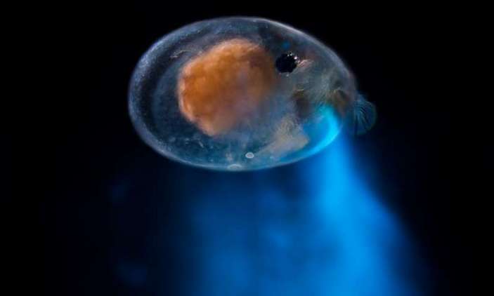Рачок из семейства Cypridinidae испускает свет. Видно, что он идет из верхней губы. Фото © Elliot Lowndes с сайта phys.org