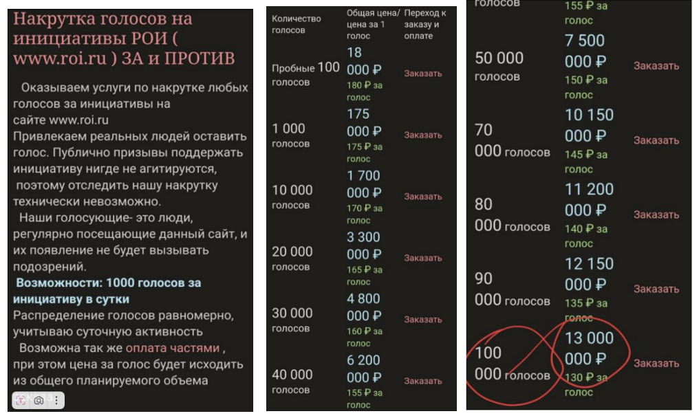 При наборе в поисковике Яндекс фраз: "Накрутка голосов Гос услуги" и "Накрутка голосов РОИ", выходит целый ряд предложений услуг накрутки. Схема накрутки такая: есть ботоферма - 100 000 реальных людей с личными страницами на Гос. услугах. При размещении заказа их оповещают о плане действий с фиксированной ценой за голос. Вот некоторые из примеров предложений накрутки: https://nakrutka-golosovanii.blogspot.com/2016/02/wwwroiru.h... Сайт действует с 2016 года и если домен оплачен и сайт рабочий, значит спрос на накрутки голосов есть. Видео сайта с экрана: https://disk.yandex.ru/i/tGSfh9UC0eD-iQ