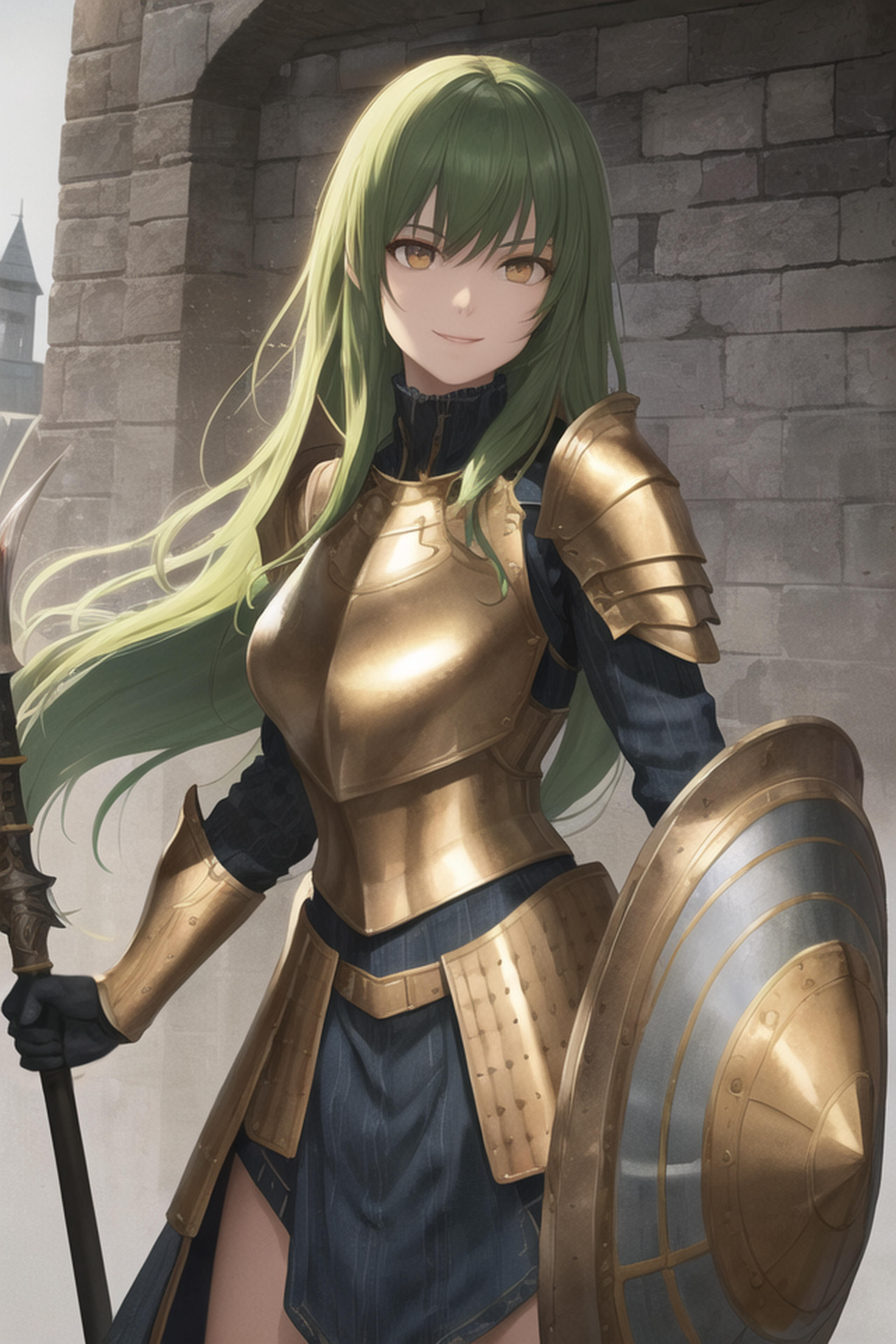 masterpiece, best quality, CG, wallpaper, HDR, high quality, high-definition, extremely detailed, lot of details, (intense shadows),(intense lighting), (detailed:1.1), very detailed eyes, very detailed face, very detailed hair, very detailed background, 1girl, female, fullbody, fullplate armor, standing, town, shield, holding shield, spear, holding spear, long hair, medium breasts, green hair, golden eyes, smile, holding weapon, solo,