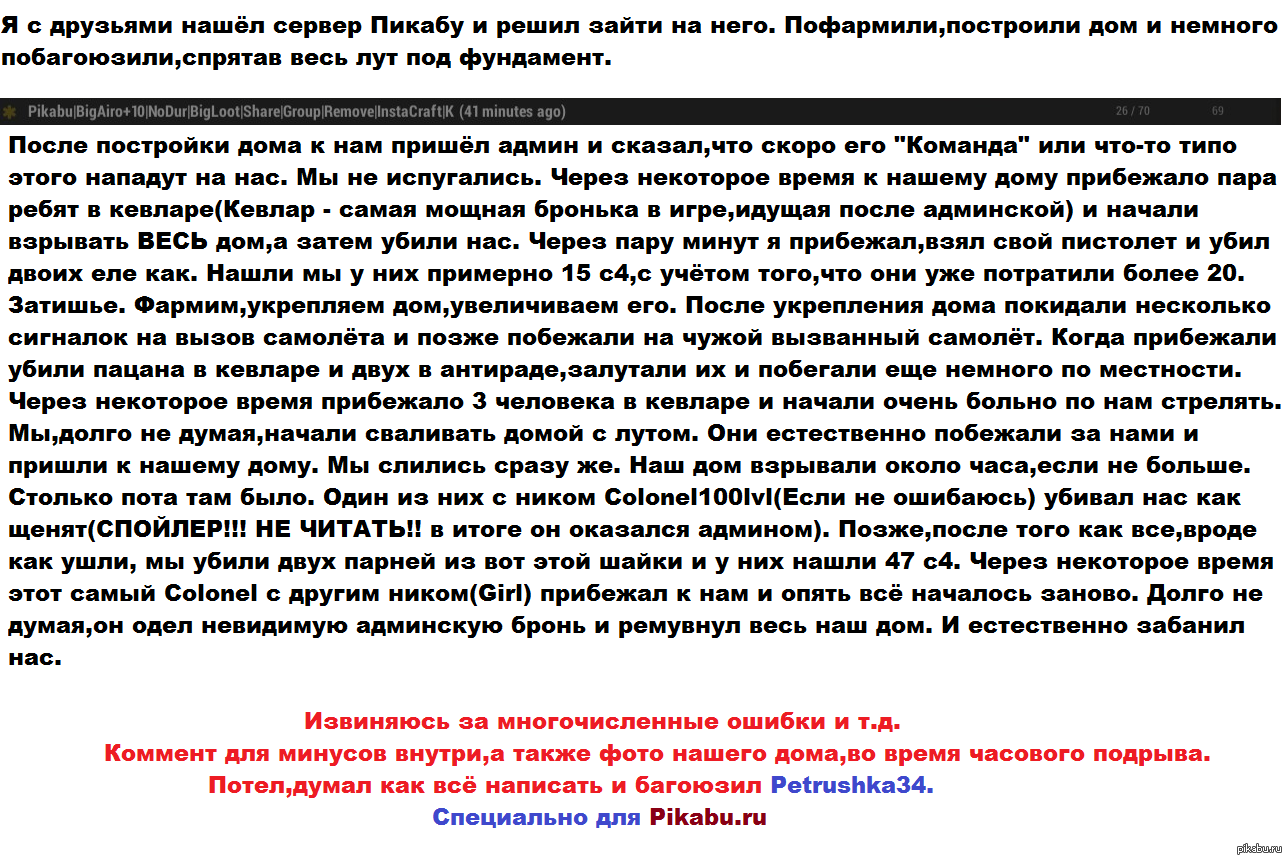 17 Petrushka34 Зашли на сервер Пикабу в Rust. 11 лет назад Поднимите хотя бы немного,чтобы люди,играющие на серве увидели. Спасибо за достаточно хорошее настроение от игроков : Esen,B.i.B,SexyGirl. [моё] Пикабу Rust Баг Ошибки