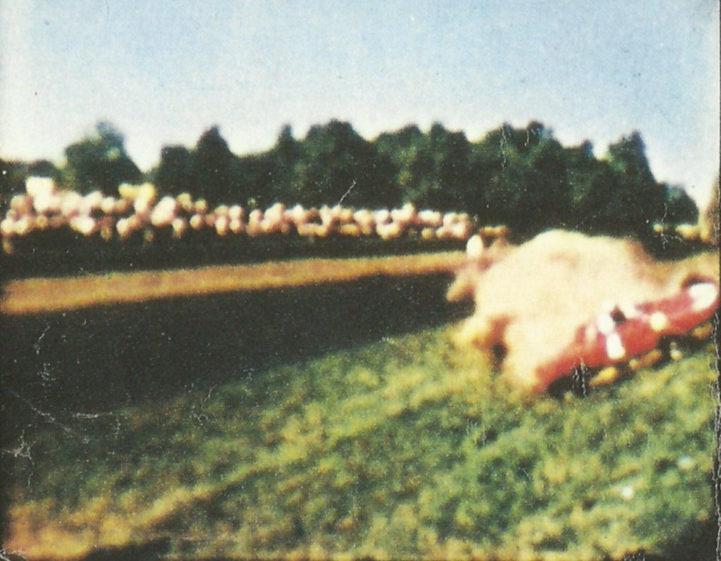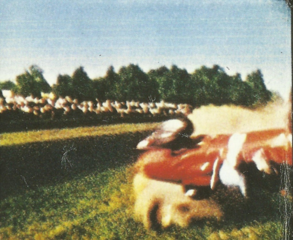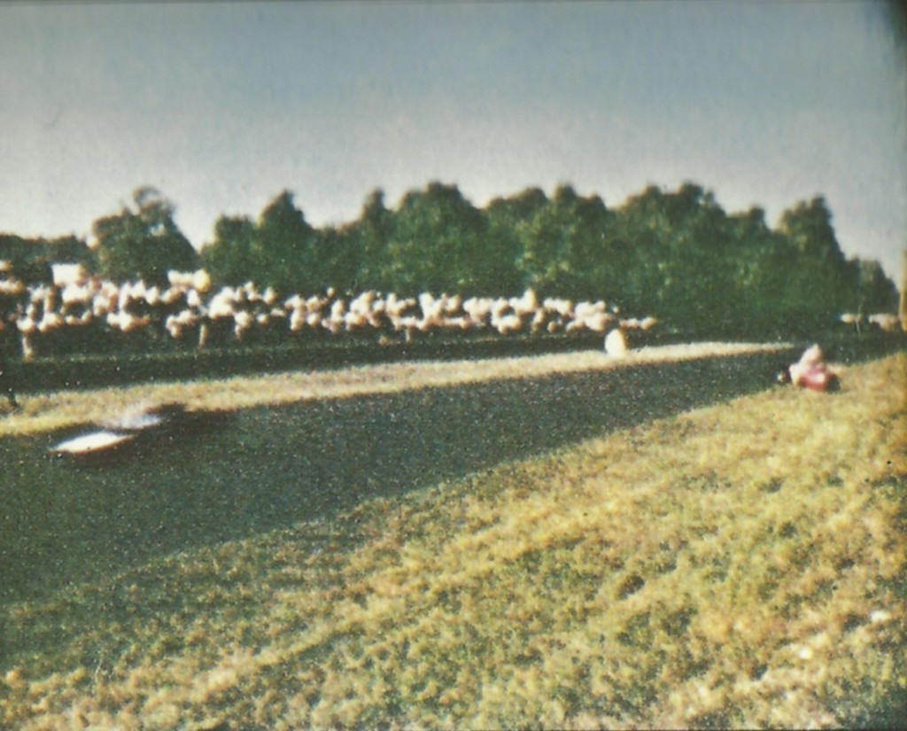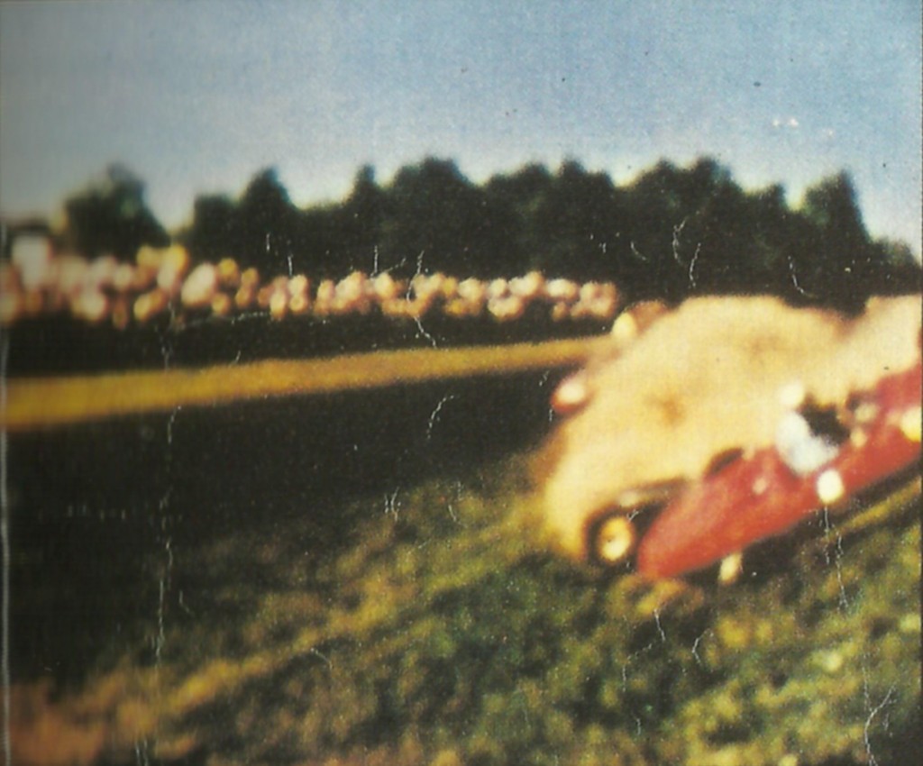 Срыв переднего колеса "Lotus" сделал "Феррари" №4 неконтролируемой, машина снесла ограждение и плотно стоящих вдоль забора зрителей прежде, чем вращение вернуло её на трассу. Гонщик лежал перед поворотом, отброшенный как тряпичная кукла; Джим Кларк блуждал невредимый, но находящийся в шоке, когда автомобили уходили на третий круг; один гонщик и 14 зрителей должны заплатили жизнью за своё увлечение. Гонка продолжилась, и партнёр по команде Фил Хилл стал коронованным Чемпионом мира, а Вольфганг фон Трипс был мёртв. Такова была абсолютная реальность автогонок." (c) `Who is Who` by Steve Small, 2000