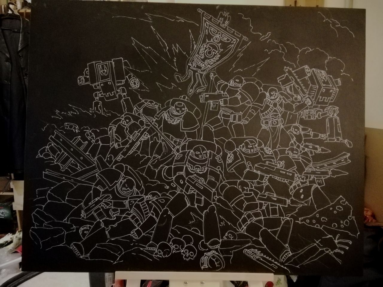 Решил писать на темном холсте и перенести рисунок белой калькой, потом обвести белым маркером. Где-то месяц холст украшал мастерскую, радовал понимающих гостей и озадачивал приходящих детей (давших ему почетное наименование сначала ЧОРНАЯ КАРТИНА, потом СИНЯЯ КАРТИНА).