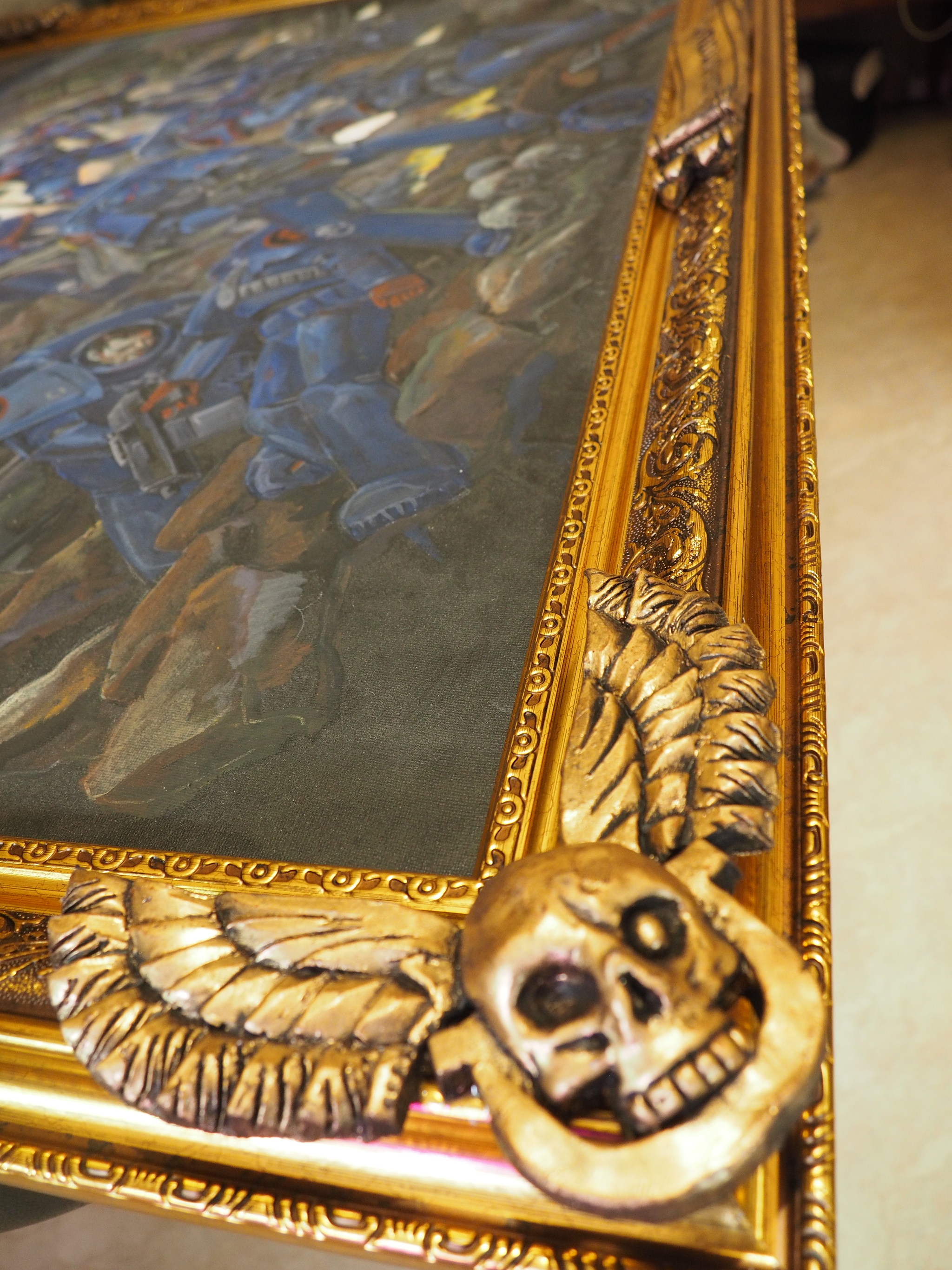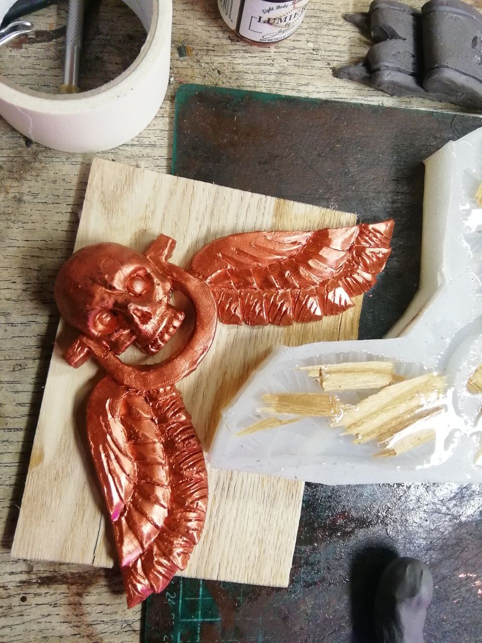 По углам рамы решил сделать черепа с крыльями и омегами, а внизу девиз ультрамаринов, так что понадобился формовочный силикон и много эпоксидной смолы. Слепил все из пластилина, залил силиконом, когда тот высох - вытащил пластилин и залил в формы эпоксидку. 48 часов ждем, пока затвердеют.