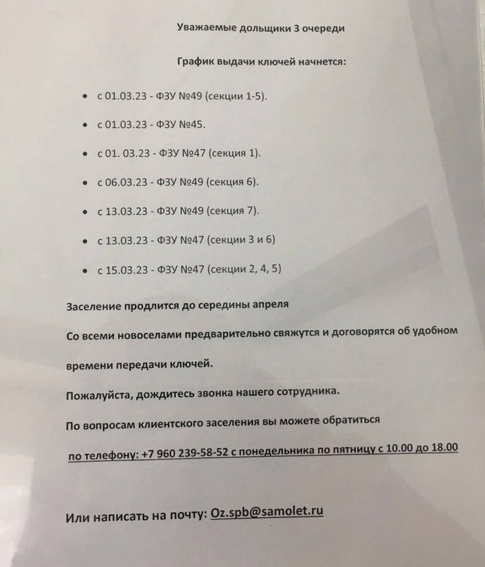 Отдел заселения делал смс-рассылку о ключах в марте, вывешивал график приглашения на АПП - и нарушил все сроки. Люди попросту находятся в подвешенном состоянии и не имеют ни малейшего представления: а будут ли ключи хотя бы до июня?